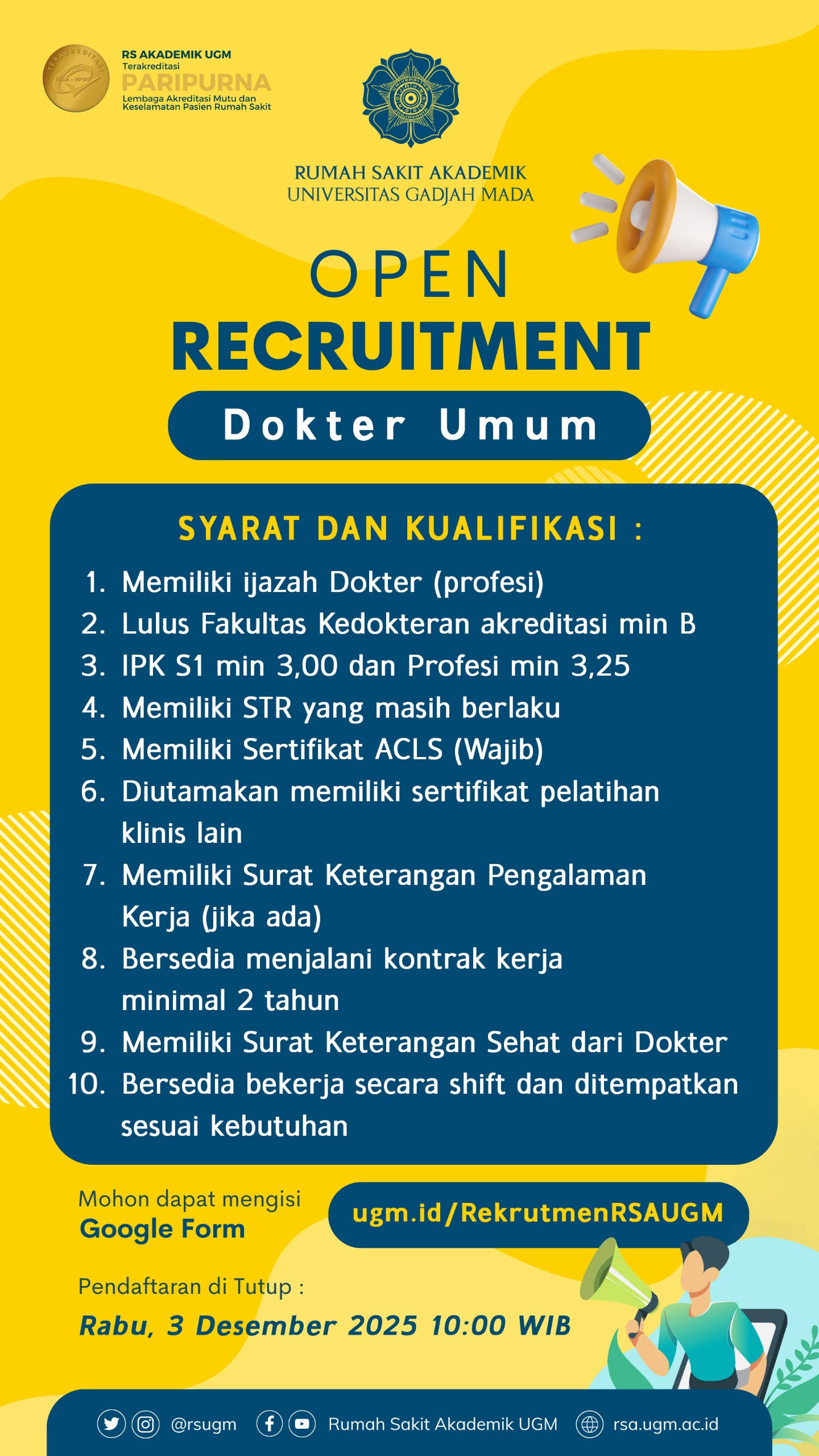 Silahkan untuk dapat mengisi Google Form dengan link berikut : ugm.id/RekrutmenRSAUGM, syarat dan kualifikasi terlampir seperti gambar diatas.